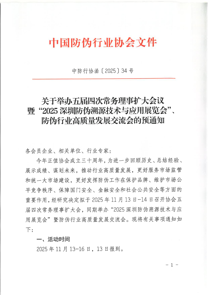 五届四次常务理事扩大会暨“2025深圳防伪溯源技术与应用展览会”、 防伪行业高质量发展交流会预报名 各位参会代表: 协会拟于2025年11月13日-14日召开协会五届四次常务理事扩大会议,同期举办“2025深圳防伪潮源技术与应用展览会"暨防伪行业高质量发展交流会。请您于9月20日前提交预报名电子回...