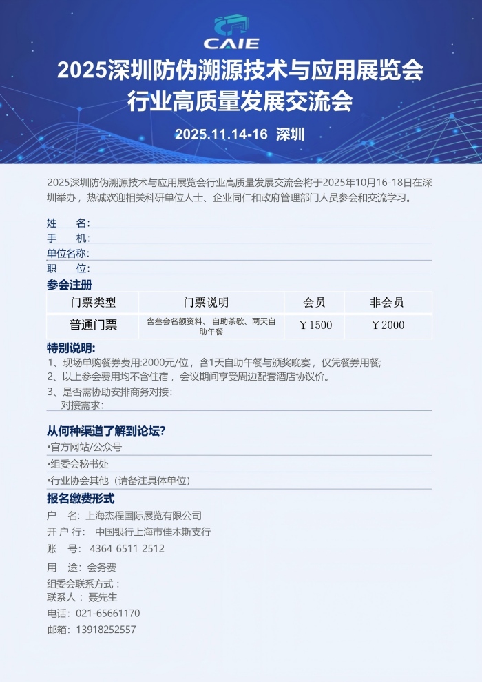 一、活动关键背景 本次交流会为2025深圳防伪溯源技术与应用展览会同期重要活动,将于2025年11月13日-14日在深圳国际会展中心举办,中国防伪行业协会等权威机构主办。上海杰程国际展览有限公司承办,活动聚焦防伪行业技术创新与产业升级,汇聚全球前沿技术成果与行业精英,打造“技术研发-场景应用-标准制定”全产业链交流平台。 二、演讲嘉宾招募(最后2个...